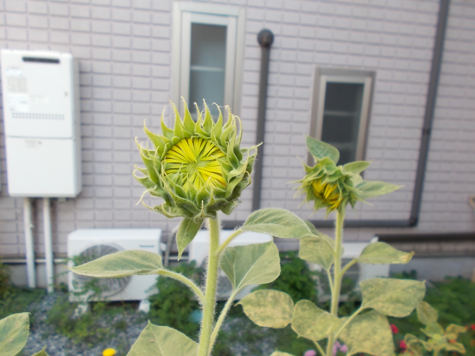 来た来た来たー!!ご利用者の皆様が2ヶ月前に播いて下さったヒマワリが開花しました!背の丈は1.5m程。厳しい陽射しにより葉焼けを起こし、虫が発生している所もありますが、ハツラツとした元気な花を咲かせ、次々とつぼみも生み出してくれています☆☆