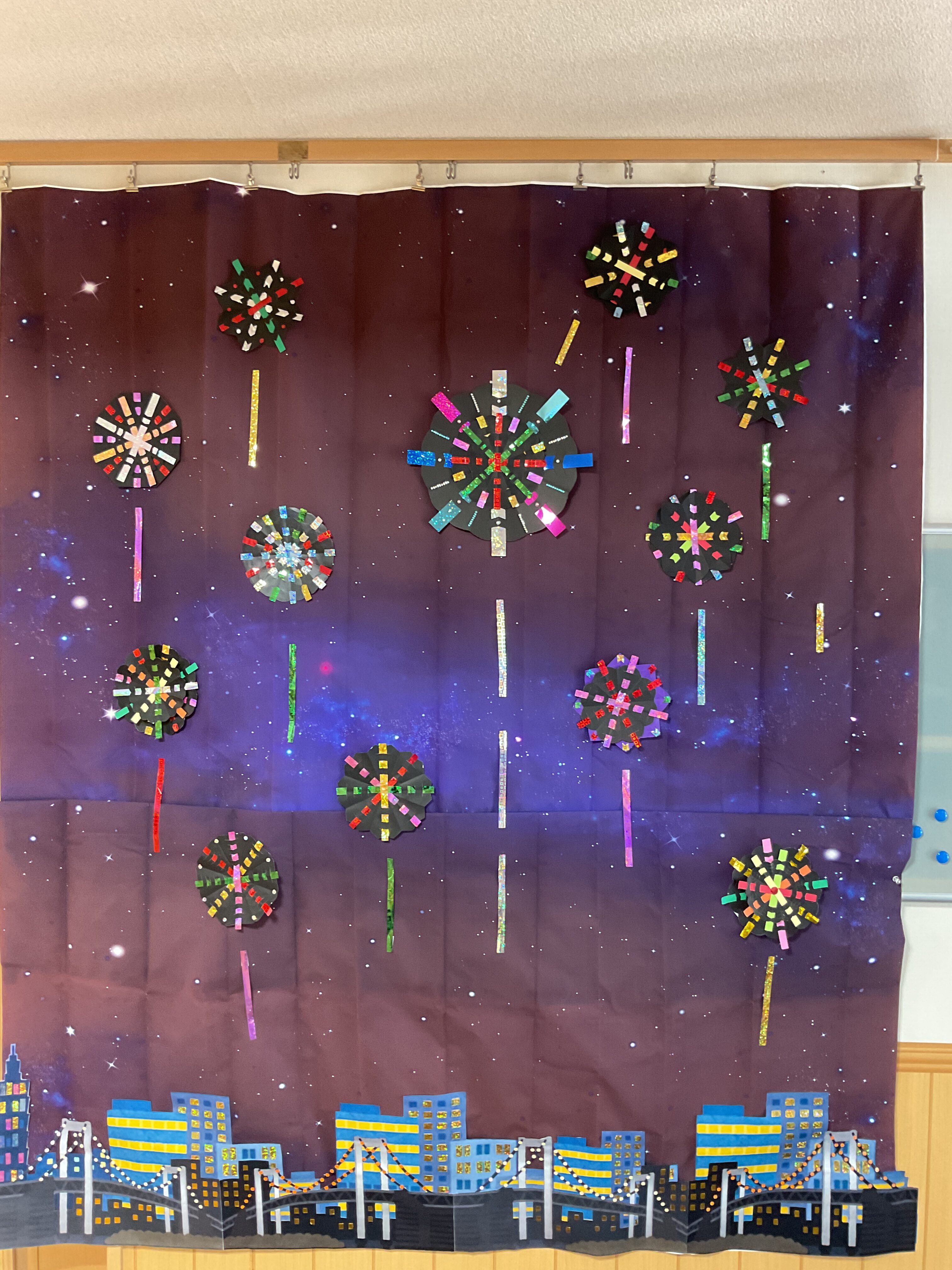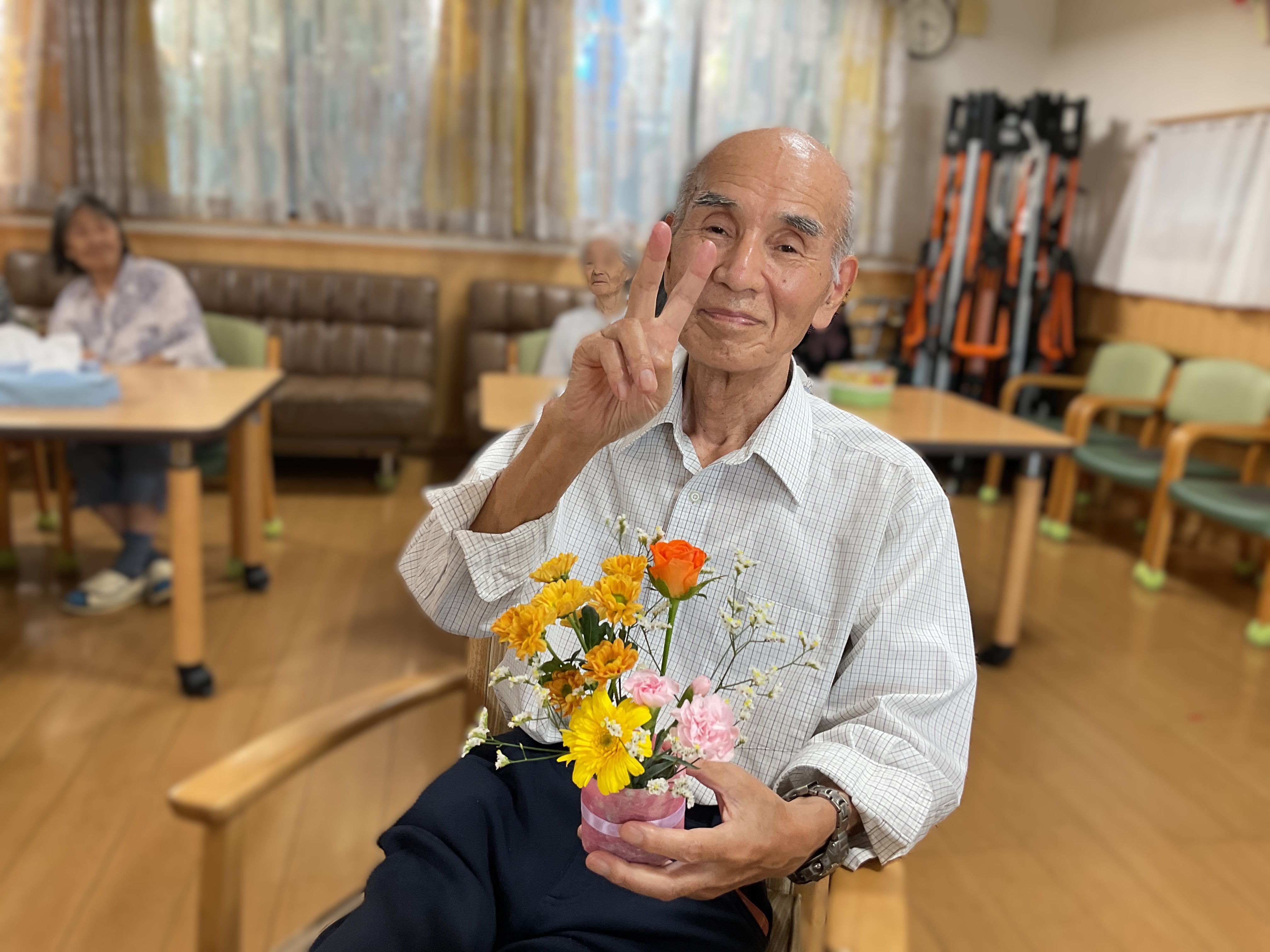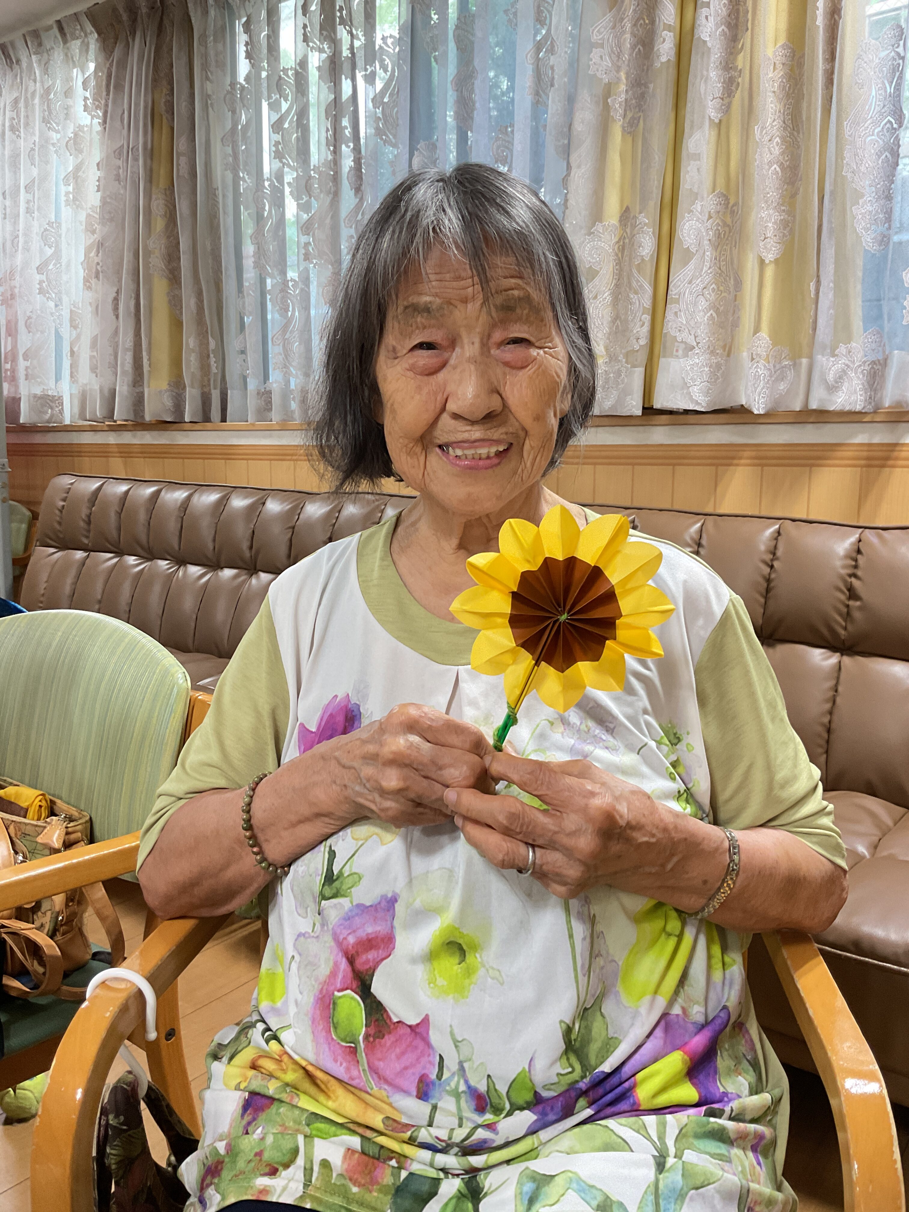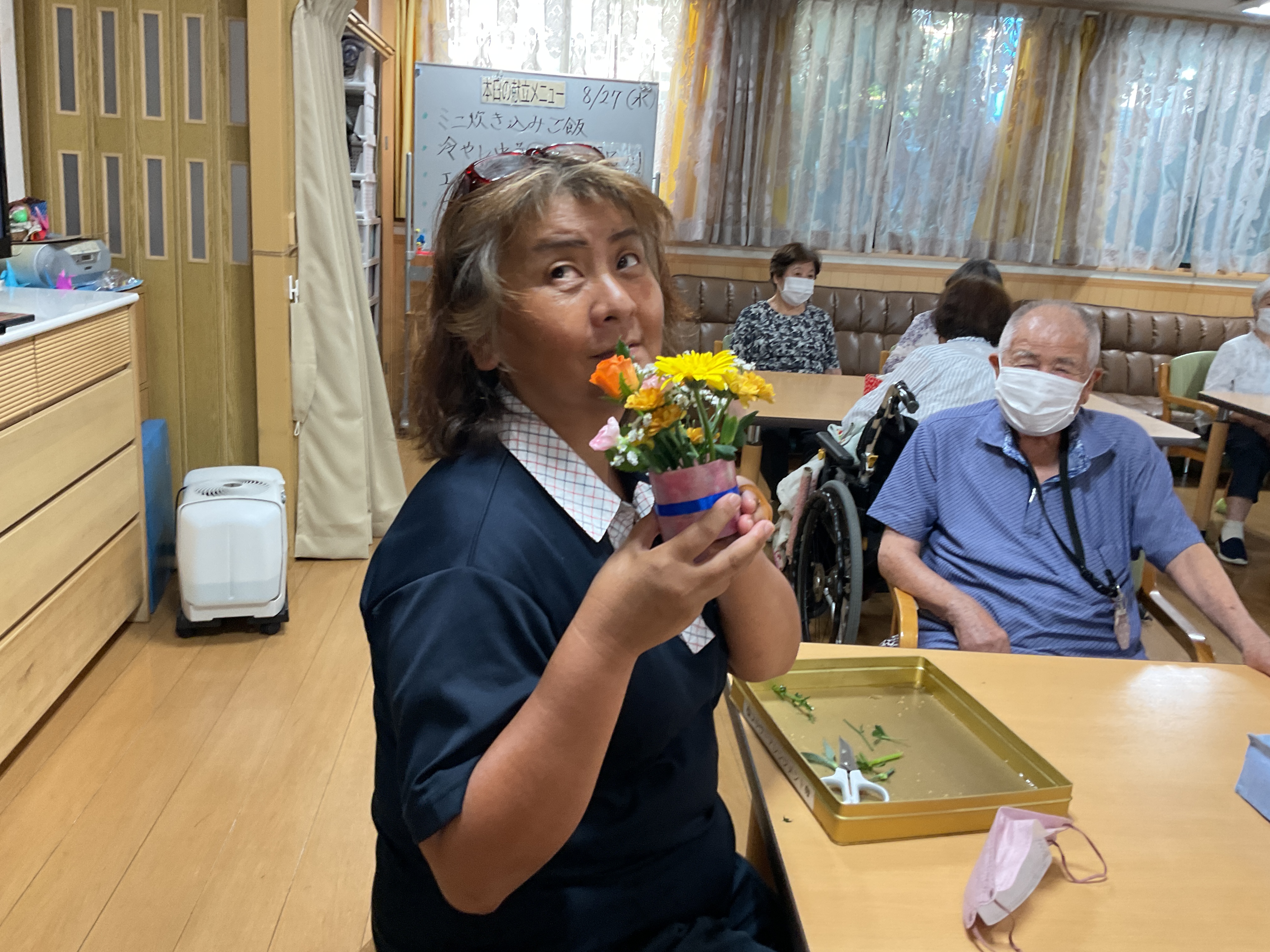 8月の思い出 いっぱい食べて夏を乗り切る!「サムギョプサル定食」ランチ 花火の壁面作品🎆・🌻の団扇作成・フラワーアレンジメントレクと楽しみました♬