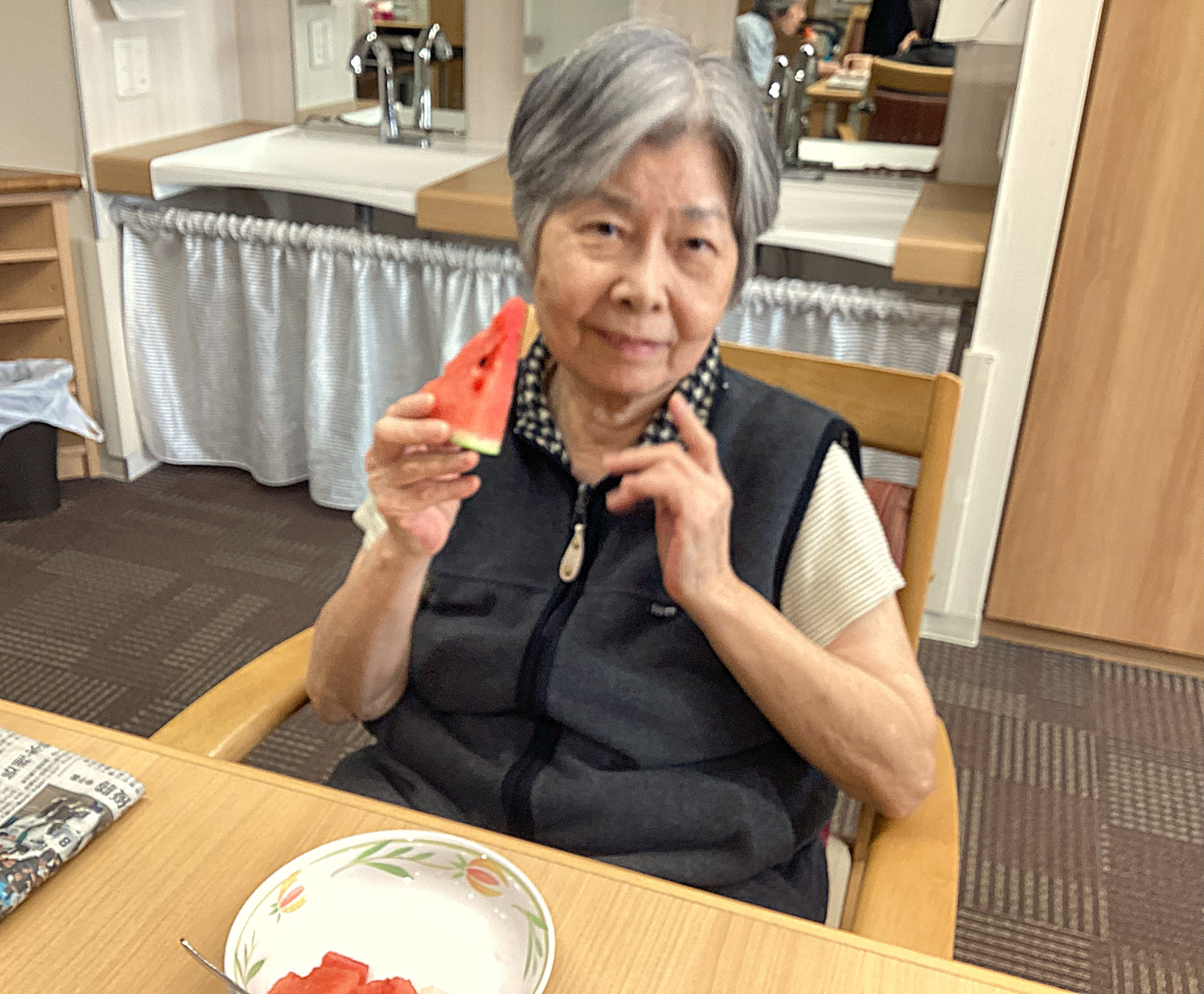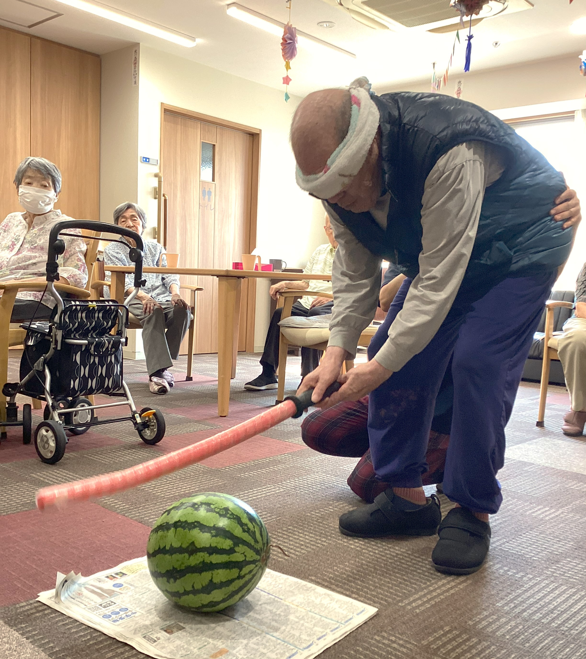 すいか割りならぬ、すいか叩き。みなさん高齢ですが、叩く勢いがすごい!職員が一緒に付き添い、目隠しをしましたが上手く叩けました😲 その後は美味しく頂きました。