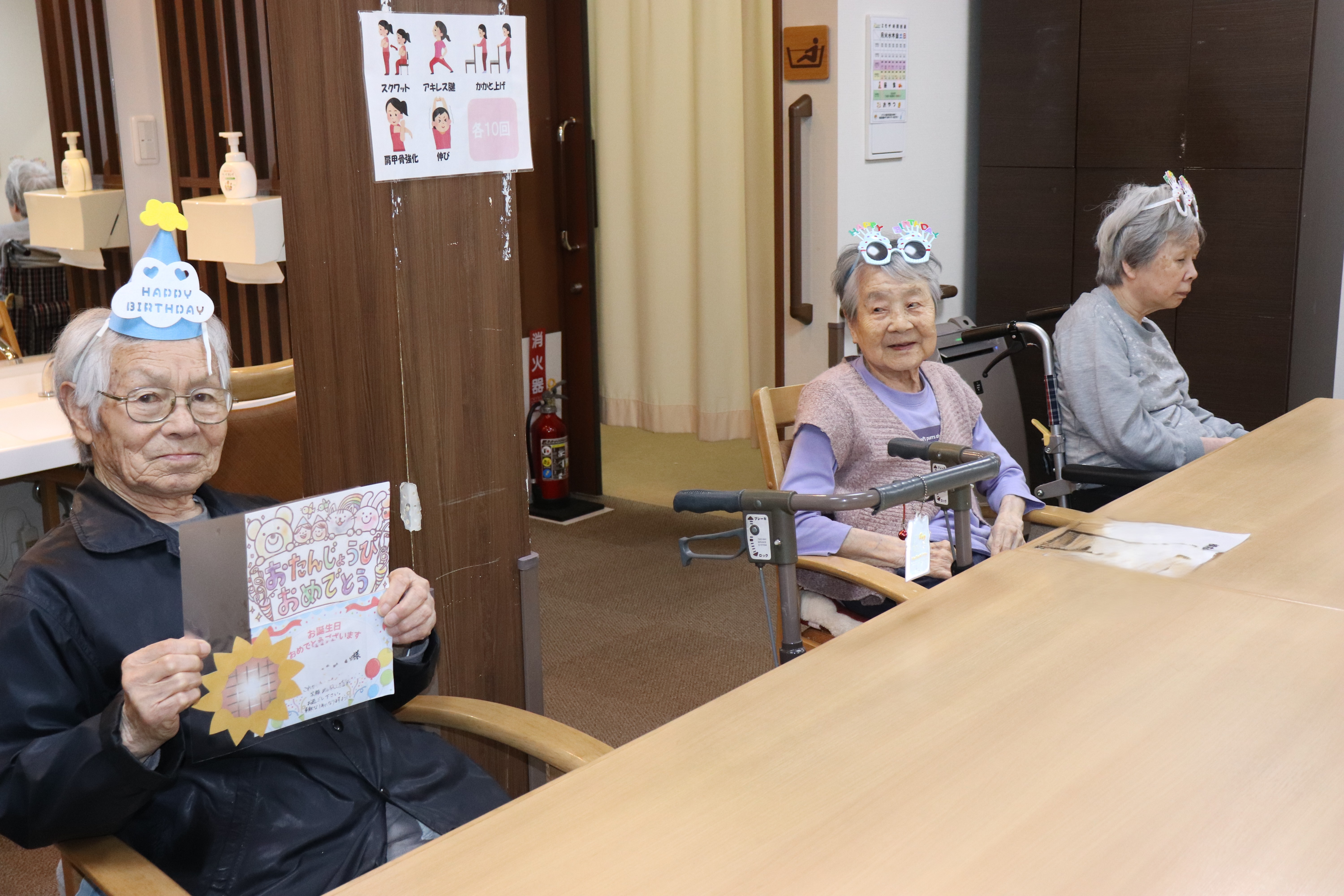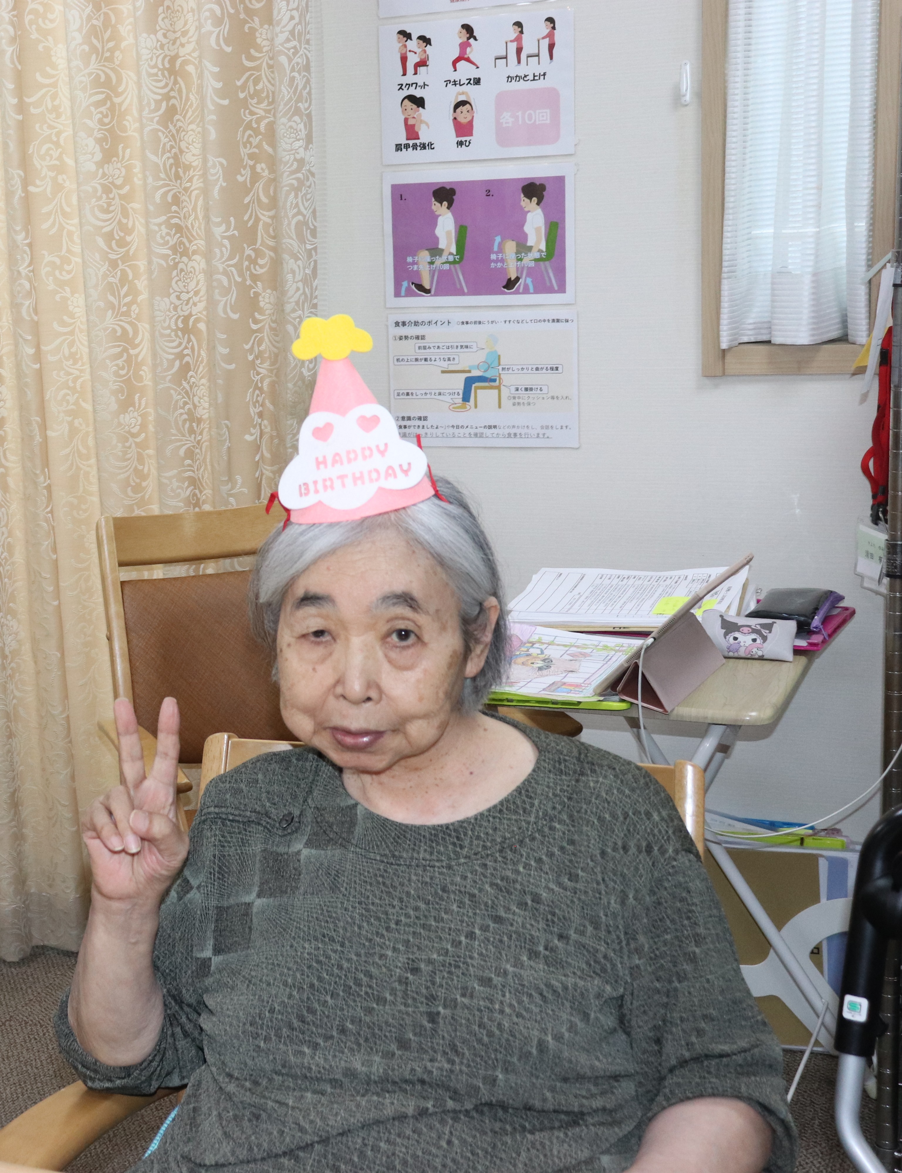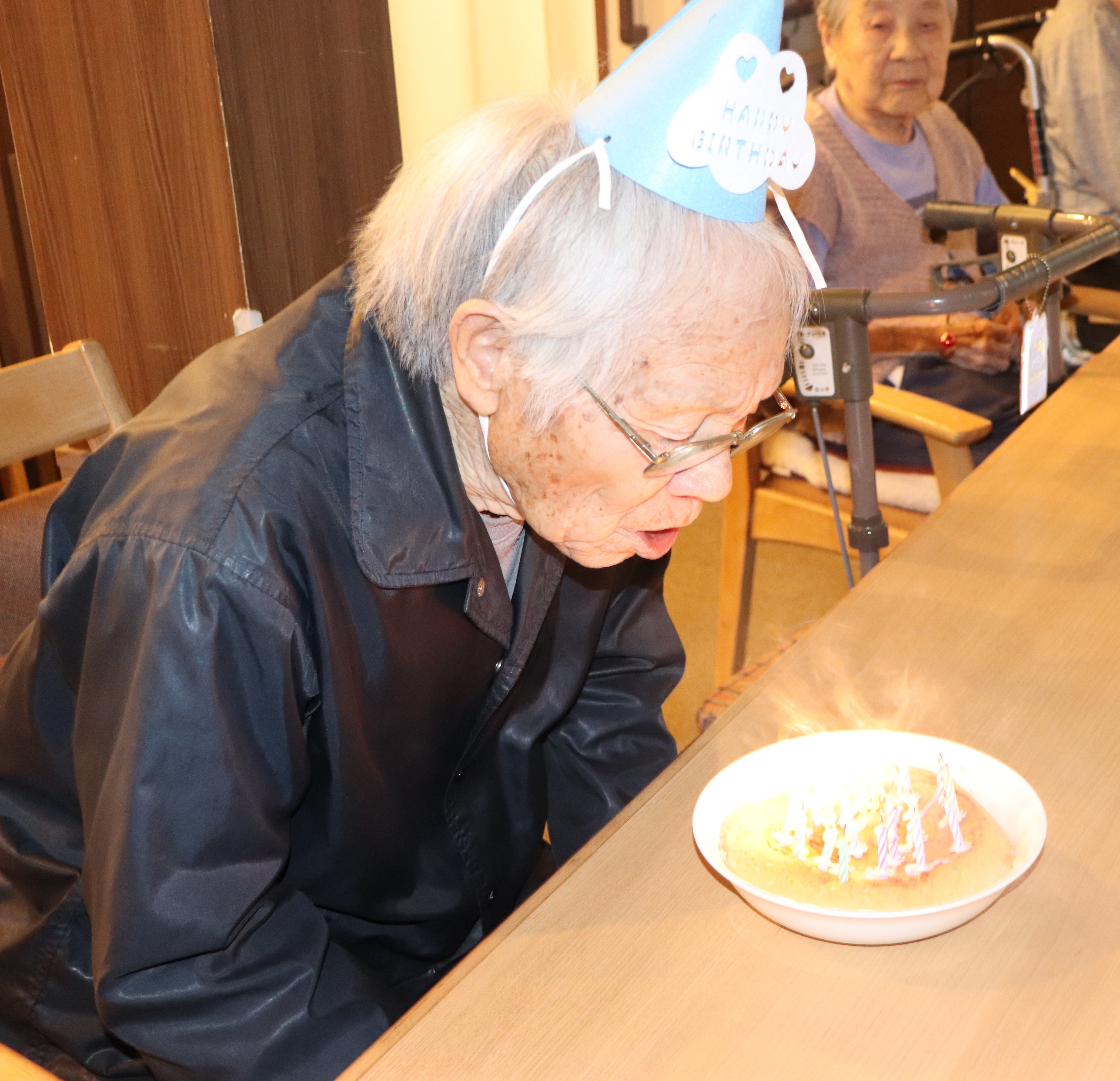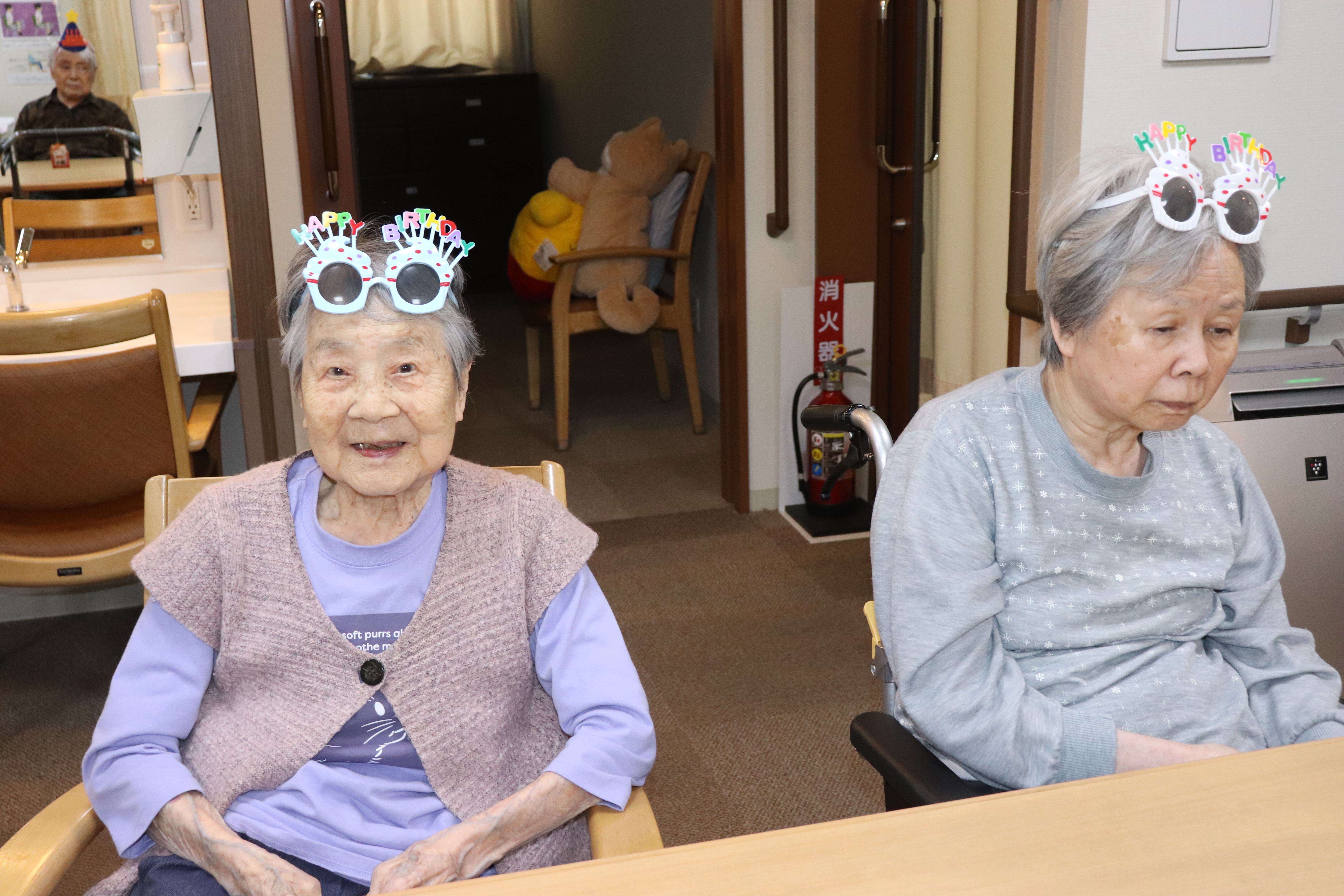 お誕生日おめでとうございます🎉🎉 皆様で被り物をして、お祝いしました(#^.^#) 最後は、ケーキ🍰にロウソクをたて、フ~と火を消していただきました💕 美味しく職員手作りのケーキを食べました♪♪