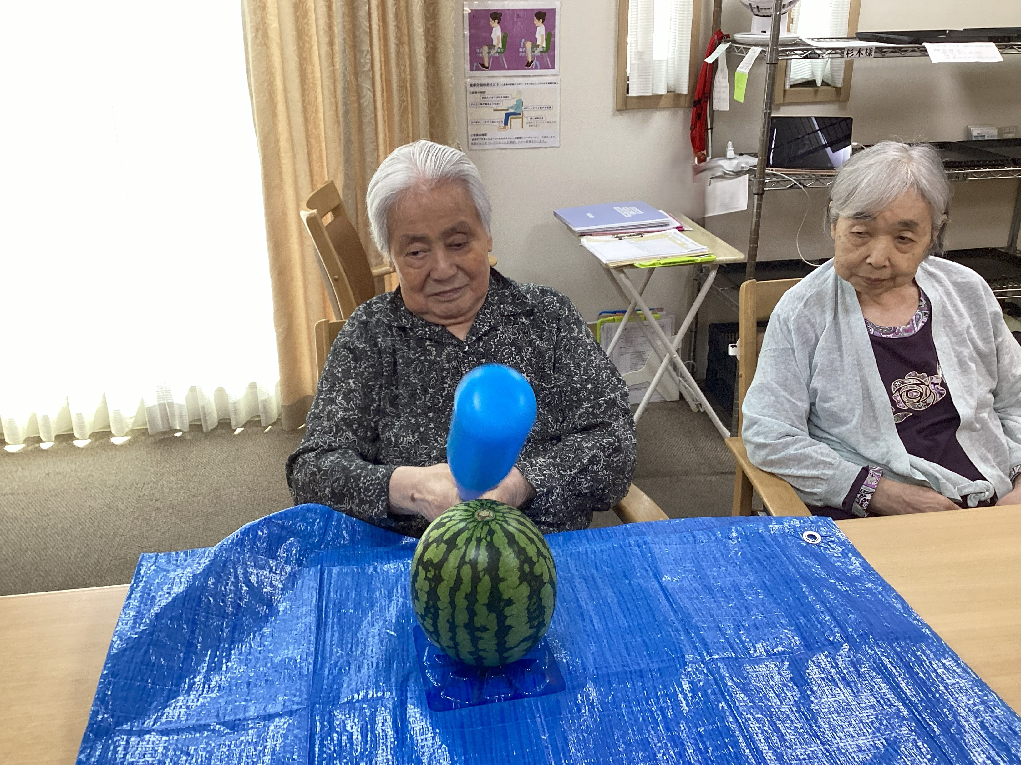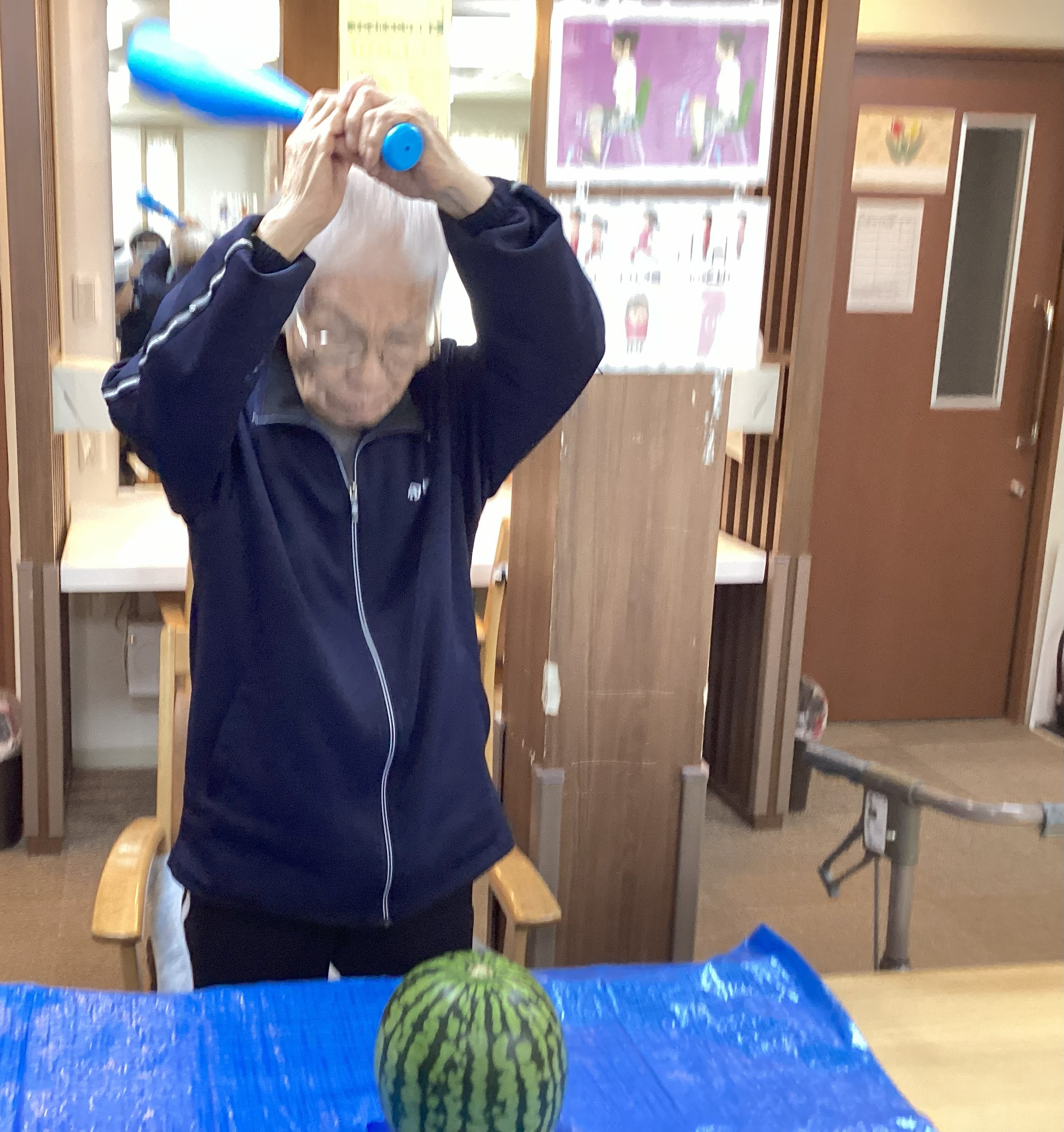 夏と言えば「🍉スイカだ」という事で スイカ割りを楽しみました(^^♪ 男性ご利用者様の無我夢中に、小さい時の思い出がよみがえりました(>_<)