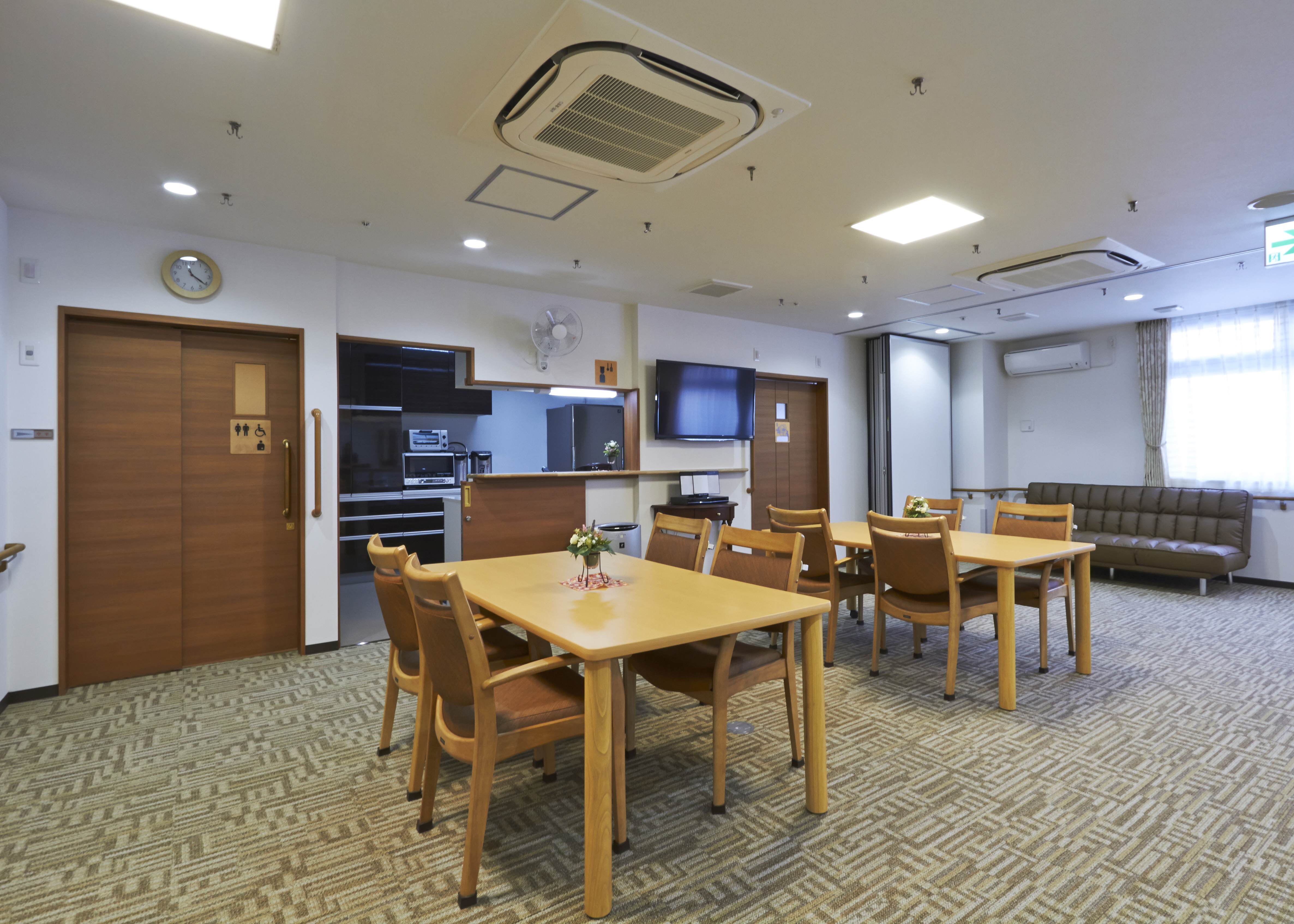 事務室・リビングルーム・談話室・一般浴室・機械浴室・脱衣室・キッチン・洗濯室・共有トイレ・エレベーター・駐車場